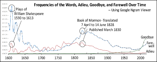 As can be seen in Figure 1, the valediction adieu has a roller-coaster history. The modern replacement of adieu with goodbye is plainly visible.13 An apparently high-frequency usage period for adieu occurred during the time of William Shakespeare, who used adieu 96 times in his 38 plays (more on this below). Another high frequency period occurred in the 80-year period from approximately 1820 to the late 1800s, which includes the publication date for the Book of Mormon and other events of the Restoration. Joseph Smith certainly could have known this common word. This assertion will be further supported later in this paper.