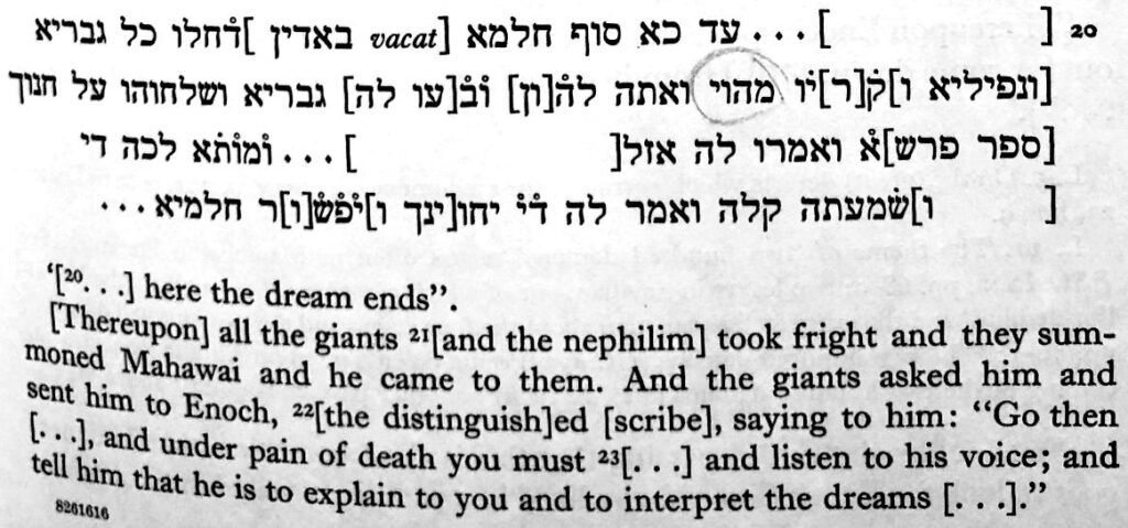 We begin our discussion of this question with a summary of Townsend’s views on the origin of the Book of Giants name Mahaway (MHWY). Adopting suggestions from current scholarship on the issue, he concludes that the name is related to the Aramaic verb to be. We will show why these suggestions are not as promising as they may seem at first glance.[Page 183]