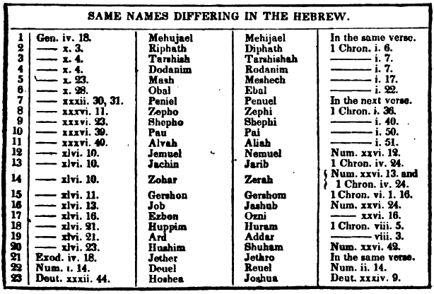 - As an alternative scenario, Townsend proposes that Joseph Smith created the Book of Moses names Mahijah and Mahujah after seeing a table of name variants in the Hebrew text of Genesis 4:18 in a Bible commentary written by Adam Clarke.127 The table includes an entry containing the two similar names: Mehujael and Mehijael. Because Joseph Smith and his associates lacked the expertise to read and recognize these variants in Hebrew, even in the dubious case that a Hebrew Bible might have been in their possession, Clarke’s table (or perhaps some equivalent in another English commentary) appears to Townsend to be the only reasonable purely historical explanation at present (apart from the possibility of scribal error mentioned above) for how they could have knowingly and deliberately inserted both name spellings in the Book of Moses. We now discuss look at this hypothesis in more detail.