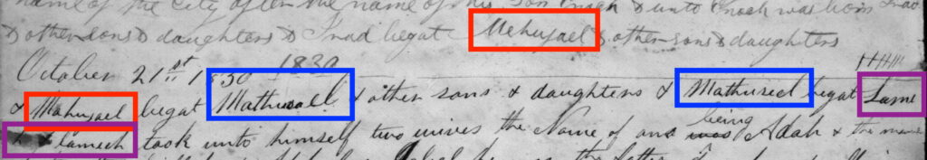 Figure 6. Genesis 4:18, JST OT1, p. 10 with variant spellings outlined: Mehujael/Mahujael (red), Mathusael/Mathusiel (blue), Lameh/Lamech (purple).137