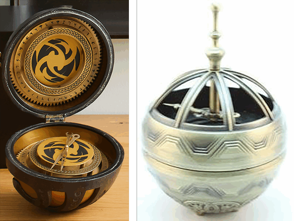 Figure 1. Left: Liahona model with ball that opens to view two horizontal pointers (Deseret Book); right: model with open top to view a horizontal pointer and a compass within (Latter Day Designs).