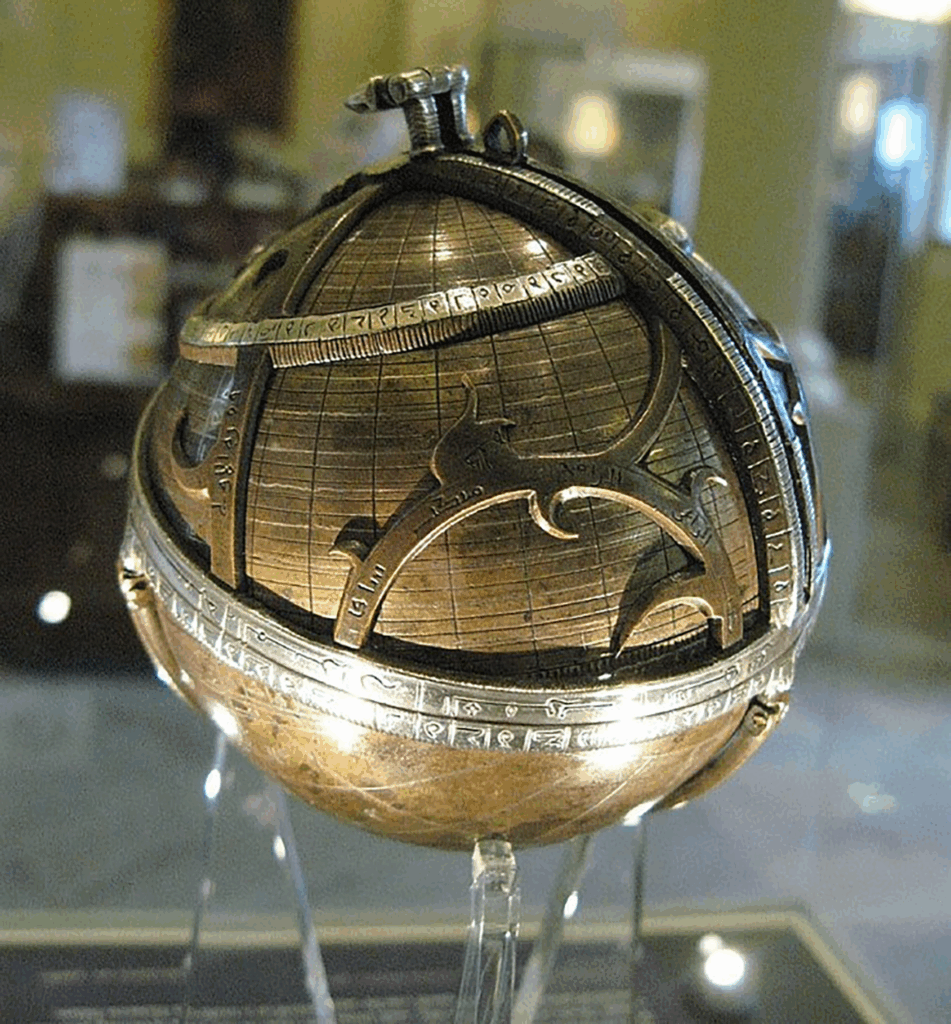 Figure 3. Spherical astrolabe from medieval Islamic astronomy, c. 1480. From the Museum of the History of Science, Oxford, UK. (Signed by Musa [CC BY 2.0], via Wikimedia Commons.)