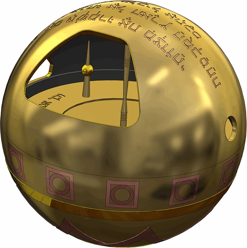 Figure 12. Model of Liahona showing how text could be written on both the outer surface of the ball and on the whorl of the pointers, also known as the miraculous directors. (Image by Kyle Kinghorn.)