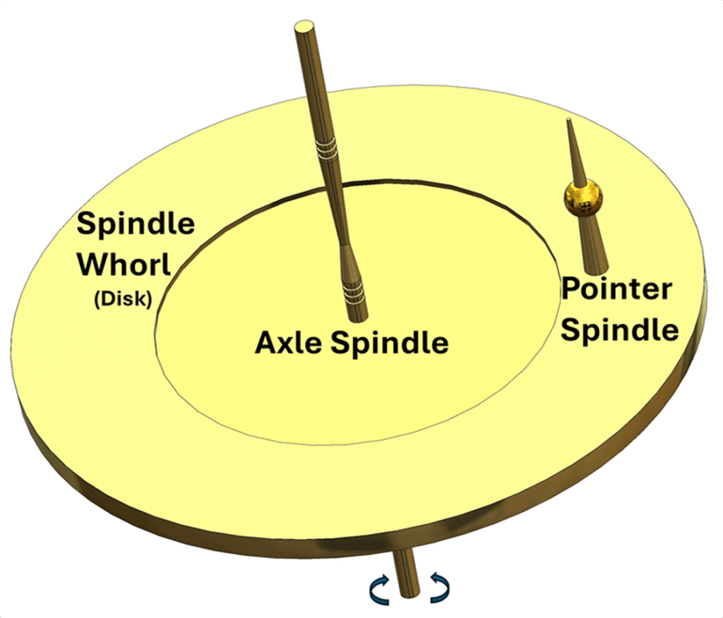 Figure 7. The “pointers” inside the Liahona. This whole pointing mechanism was sometimes called the “miraculous directors,” which consisted of an axle spindle fixed in the center of a wide whorl (disk) and a distinctive pointer spindle attached to the outer edge of the whorl. The spindle whorl and pointer spindle could rotate around the axle spindle. (Image by Kyle Kinghorn.)
