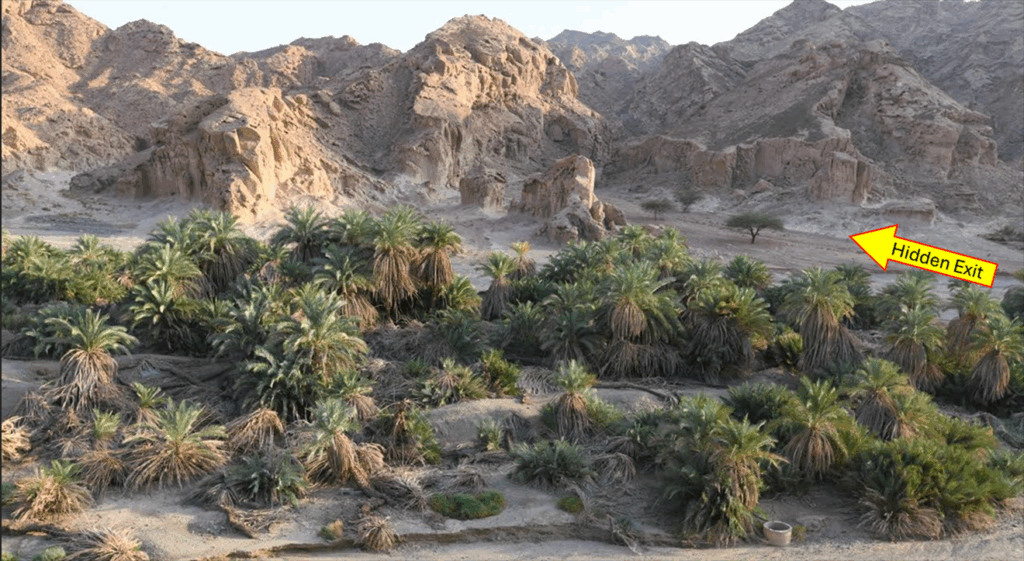 Figure 8. Valley of Lemuel, looking south from Lehi’s tent site, across the oasis of Tayyib al-Ism, with an arrow pointing toward the only southward exit from the valley. (Image courtesy of Warren P. Aston.)