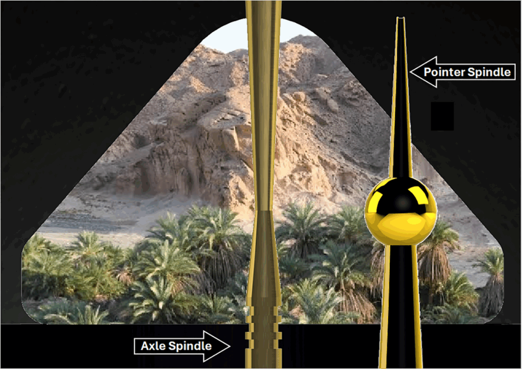 The principle point of our proposed model of the Liahona is that the two spindles were vertical inside a hollow sphere and worked like gun sights to point the direction for Lehi’s travel in the wilderness. As Alma said, “…God could cause that those spindles should point the way they should go,” (Alma 37:40). Of the two spindles, Nephi said “one pointed the way whither we should go into the wilderness” (1 Nephi 16:10). Both that pointer spindle and the second spindle would have been attached vertically to a rotating disk. We chose to place the second of the two spindles at the axis of the disk, instead of at the opposite side of the disk. Either placement of the second spindle would work, but the axis location has the dual-purpose benefit of providing the axle for rotation and reducing the chance of confusing it with the pointer spindle.