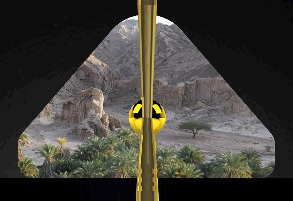Figure 10. View through the Liahona from Lehi’s tent site after turning the Liahona’s outer shell to the right until the two spindles align like gunsights in the viewing port. The aligned spindles are superimposed on an inconspicuous southward exit from the valley of Lemuel, marking the direction for travel. (Image by Wanless Southwick.)