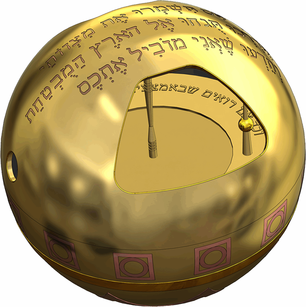 Research for this paper proved the value of having a 3-D printed, physical model to experience how the internal miraculous directors (Doctrine and Covenants 17:1) worked independently within the outer shell of the Liahona (see figure 13). Functional educational models of this vertical-spindle Liahona could be manufactured. The circular orientation of the miraculous directors could be controlled by electronic components in the bottom hemisphere, including a small stepping motor geared to the axle spindle, which would respond to the horizontal rotation of the hollow ball as detected by electronic gyroscopes. [Page 174]Instead of having the aimed-direction be under divine control, the angular setting of the pointer spindle could be determined by a button-push to retrieve a random number (1–360 degrees) from an electronic table.