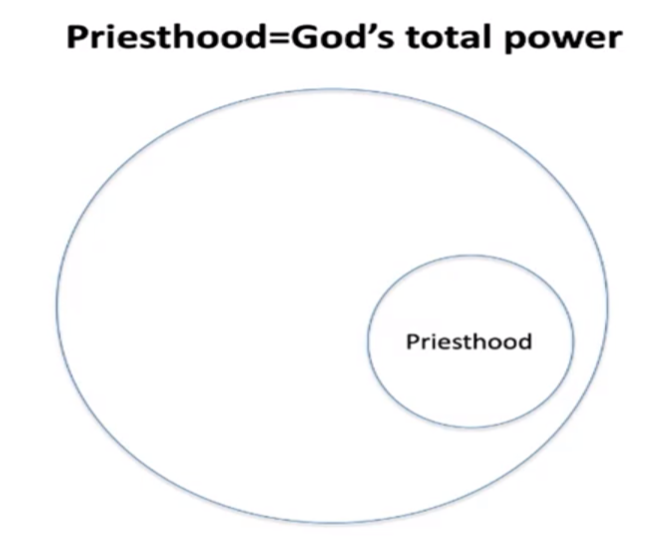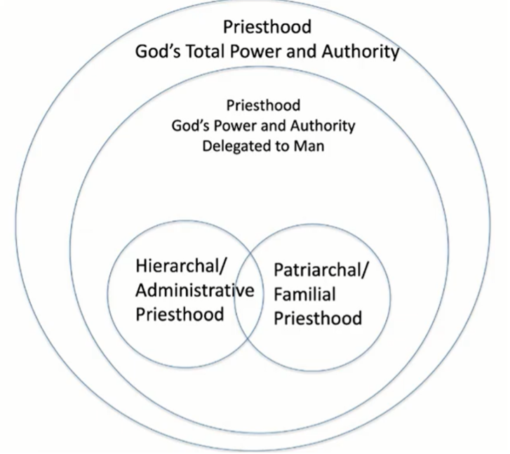 [Page 324]Perhaps another way to understand priesthood, which is both doctrinally accurate and more inclusive toward women, is to use a more holistic and historically accurate approach (see Figure 2). As is the same in the previous diagram, the largest circle of the priesthood represents God’s total power and authority. The inner circle is the priesthood described as God’s power and authority delegated to man. The final two circles are the two priesthood organizational structures that have been on the earth since the times of Adam and Eve: the hierarchical and ecclesiastical or administrative priesthood, and the patriarchal or familial priesthood. By understanding these two priesthood structures, not only do women become more included but the focus also turns from the ecclesiastical or administrative structure of the Church to temples and families, which, in reality, is the eternal structure.
